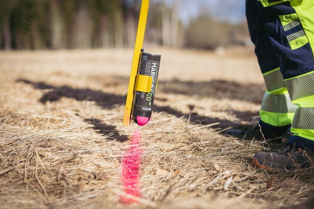 Vid kabelutsättning markeras elledningar i dag med färg på marken – ett viktigt steg för att undvika skador under grävarbeten. Foto: Geomatikk.