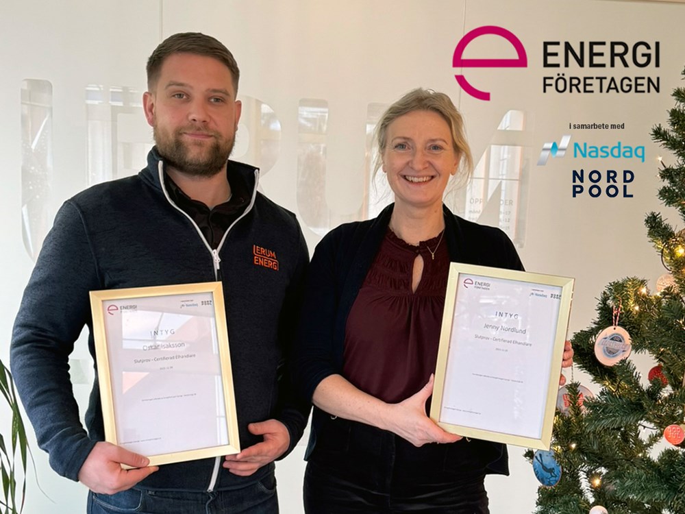 För att ytterligare stärka vår kompetens inom elhandel har marknadschef Jenny Nordlund och elhandelsäljare Oskar Isaksson genomfört Energiföretagens utbildningsprogram och erhållit certifieringen Certified Electricity Trader. Det ger oss ännu mer specialistkunskap och fördjupad förståelse för elmarknaden – och därmed bättre förutsättningar att förklara och informera om marknadens utveckling.