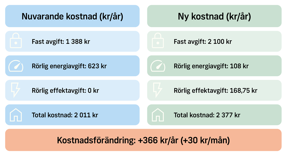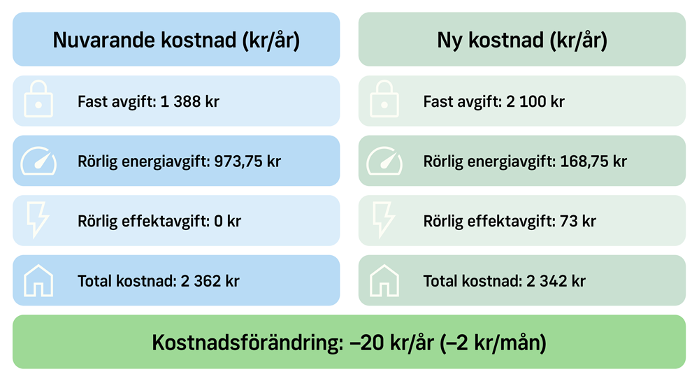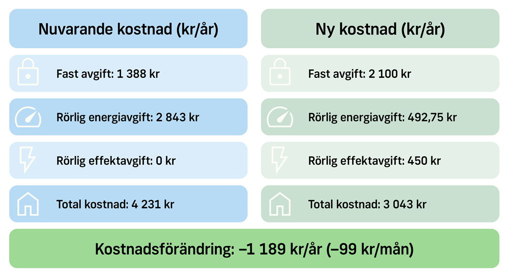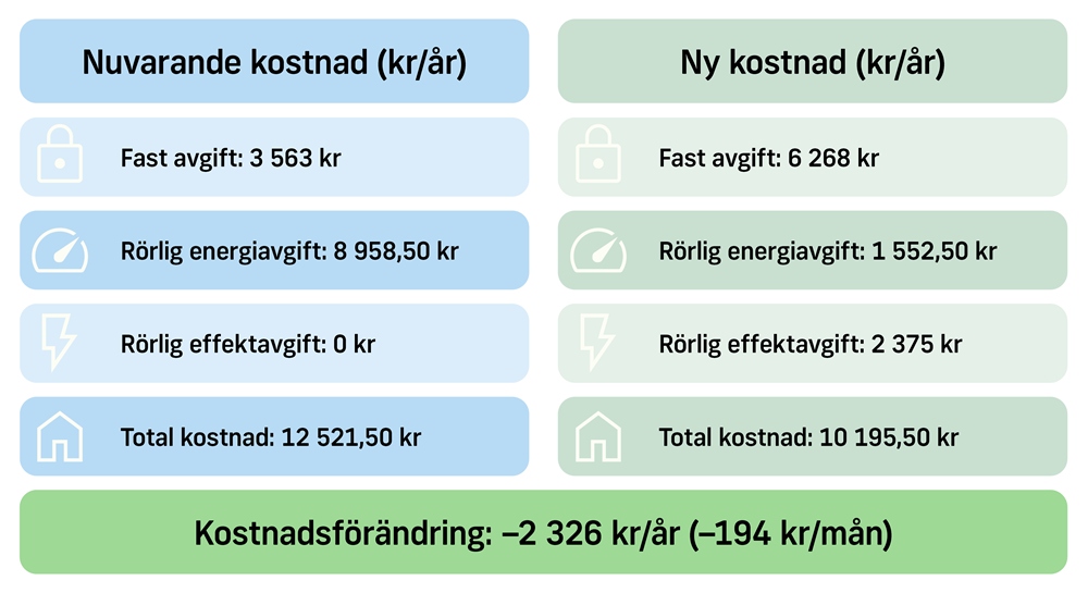 Förbrukning 1600 kWh, genomsnitt maxtimeffekt 1,5 kW.