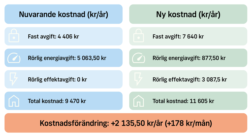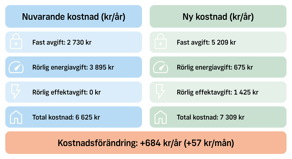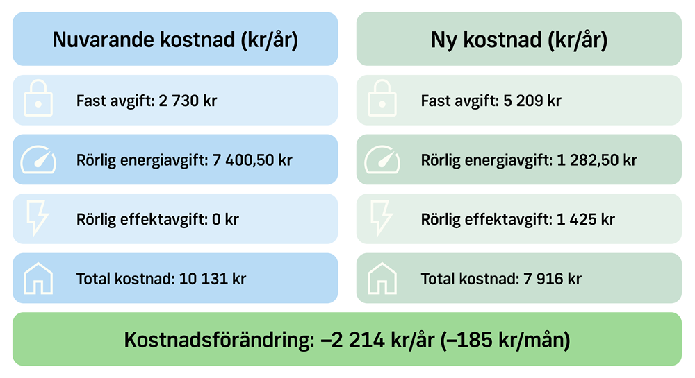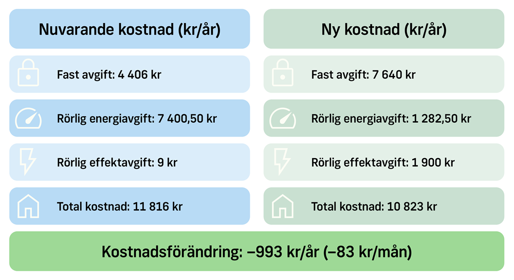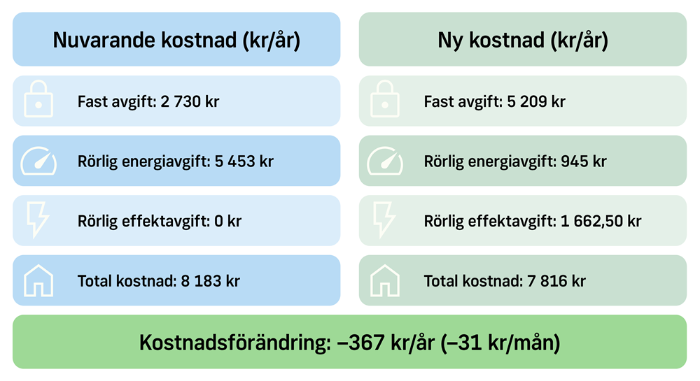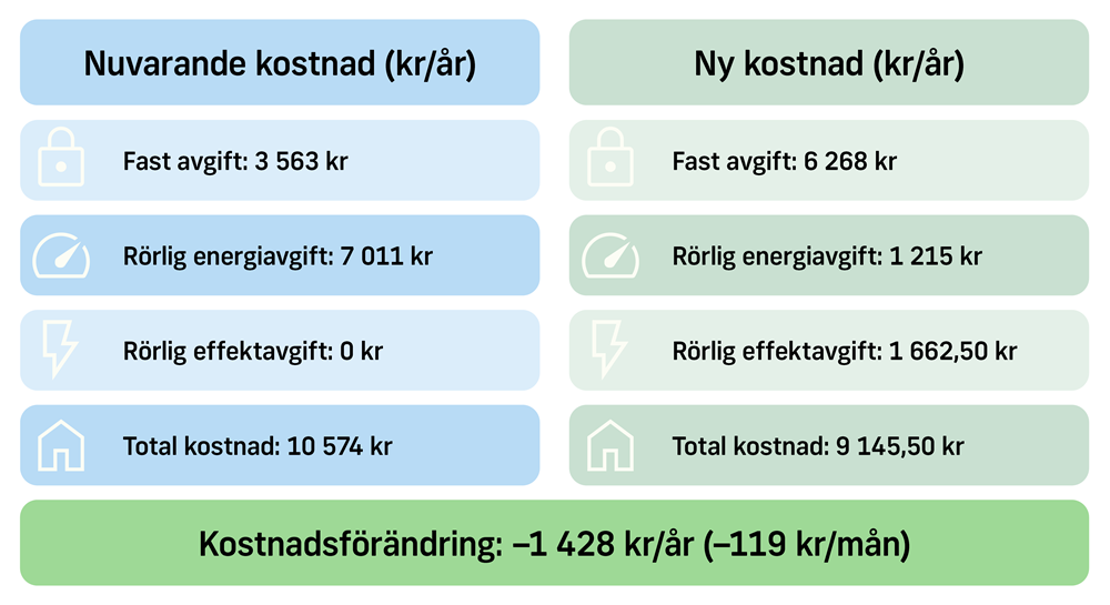 Förbrukning 7300 kWh, genomsnitt maxtimeffekt 4 kW.