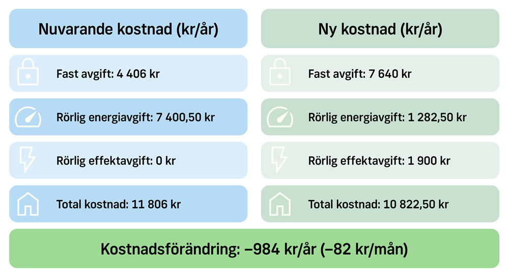 I exemplen visas nuvarande och beräknad elnätskostnad samt hur stor skillnaden kan bli per år och per månad. Beräkningarna utgår från givna förutsättningar och från antagandet att elanvändningen sker på samma sätt som tidigare. I verkligheten kan både elanvändning och effektuttag se annorlunda ut, vilket påverkar kostnaden.